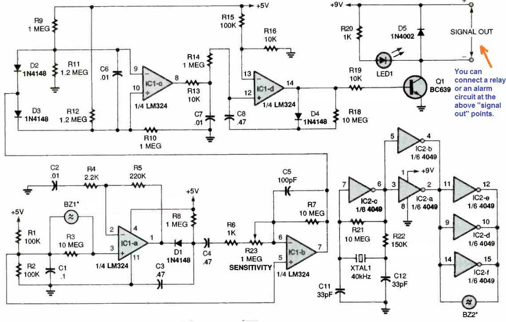 IC 4049的其余部分就像線性緩沖器一樣運(yùn)行40 kHz超聲波換能器設(shè)備BZ2。
